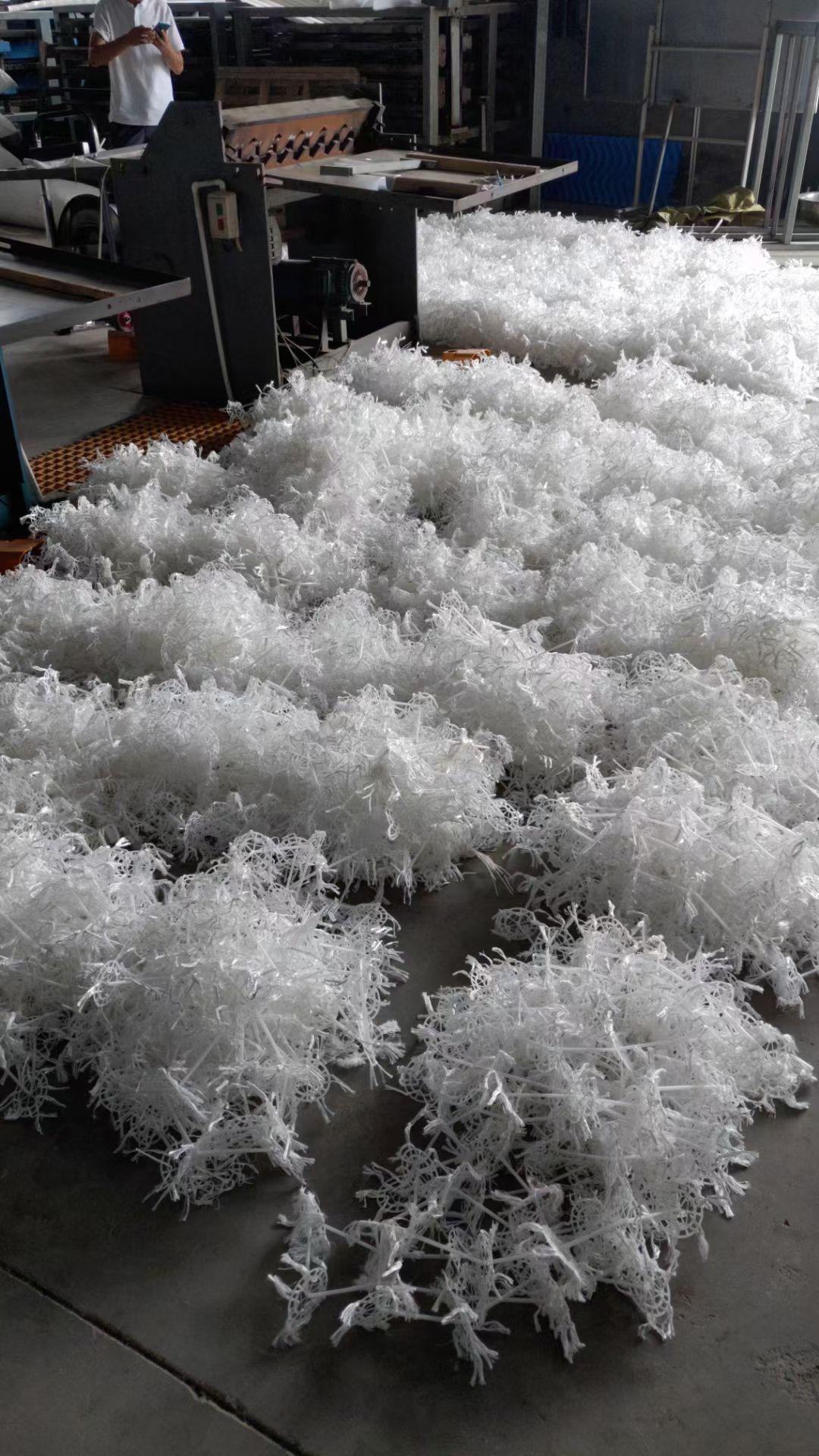 彈性填料采用耐腐蝕、耐高溫、耐老化的聚烯氣和聚酰胺,以親水、吸附、耐熱、瘙癢等添加劑的混合共聚物為材料,采用特殊的拉絲制毛工藝,將絲穿插